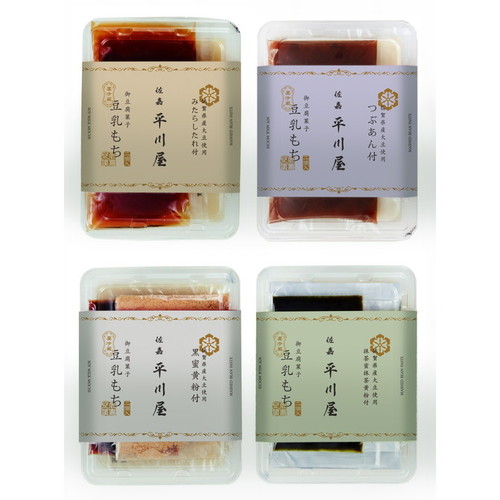 1950年創業の老舗の豆腐店「佐嘉平川屋」が名物『呉豆腐』を和のデザートに仕立てたもっちり感が特長の豆乳もち。まるで柔らかいお餅のような新食感。ほっこりとした味の定番『黒蜜・黄粉』、ほろ苦な『抹茶蜜・抹茶黄粉』、風味豊かな『つぶあん』、醤油ベースの特製たれの『みたらしたれ』。4種のフレーバーをお愉しみください。