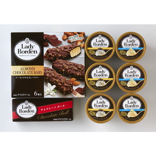 レディーボーデンミニカップ(バニラ・クッキー&クリーム)各120ml×3個、レディーボーデンマルチアーモンドチョコレートバー(50ml×6本)×1箱、レディーボーデンチョコレートボール(10ml×5個入)×1箱