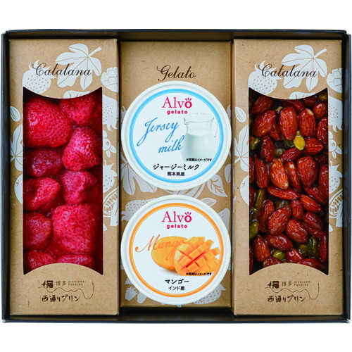 福岡県あまおう苺入カタラーナ285g×1本、チョコラーナ260g×1本、ジャージーミルクジェラート90ml、マンゴージェラート90ml