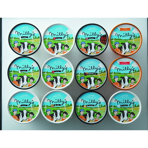 ミルク・いちごミルク各110ml×2個、バニラ・抹茶・チョコレート・黒ゴマきなこ・熟成焼きいも・ヨーグルト・みかんシャーベット・いちごシャーベット各110ml(計12個)
