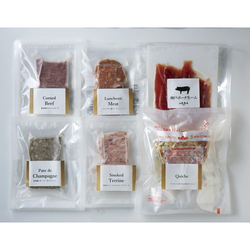 神戸ポーク生ハム50g、黒毛和牛コーンビーフ・田舎風パテ・ド・カンパーニュ・豚肉とベーコンのスモークテリーヌ各40g(2枚入)、ポルトガル風ランチョンミート40g(4枚入)、ベーコンとほうれん草のキッシュ80g(4個入)